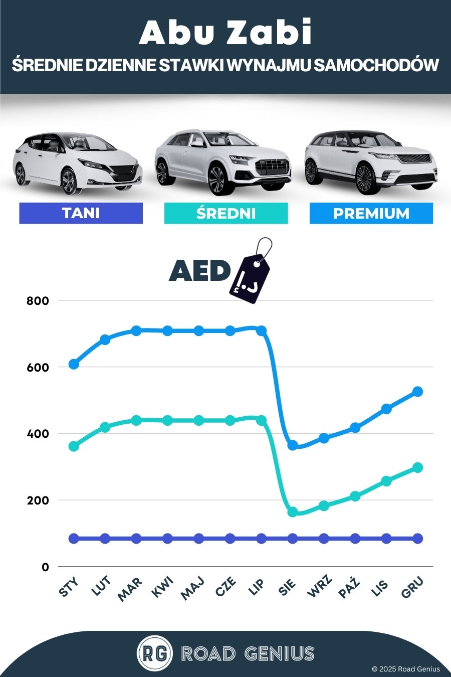 Średnio wynajem samochodu w Abu Zabi kosztuje około 362 AED za dzień, przy czym najtańsze oferty zaczynają się od 39 AED za dzień.
