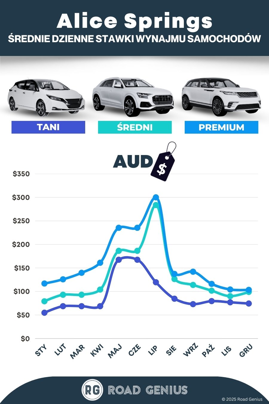 Z Road Genius z łatwością znajdziesz najlepsze oferty wynajmu samochodów w Alice Springs i w całej Australii. Porównuj ceny i rezerwuj w jednym miejscu. To proste. Wynajęcie samochodu jest praktycznie niezbędne, aby zwiedzić Czerwone Centrum – od Uluru po Góry Macdonnella. Pomożemy ci porównać dostępne pojazdy i znaleźć dogodny punkt odbioru na lotnisku lub w mieście.