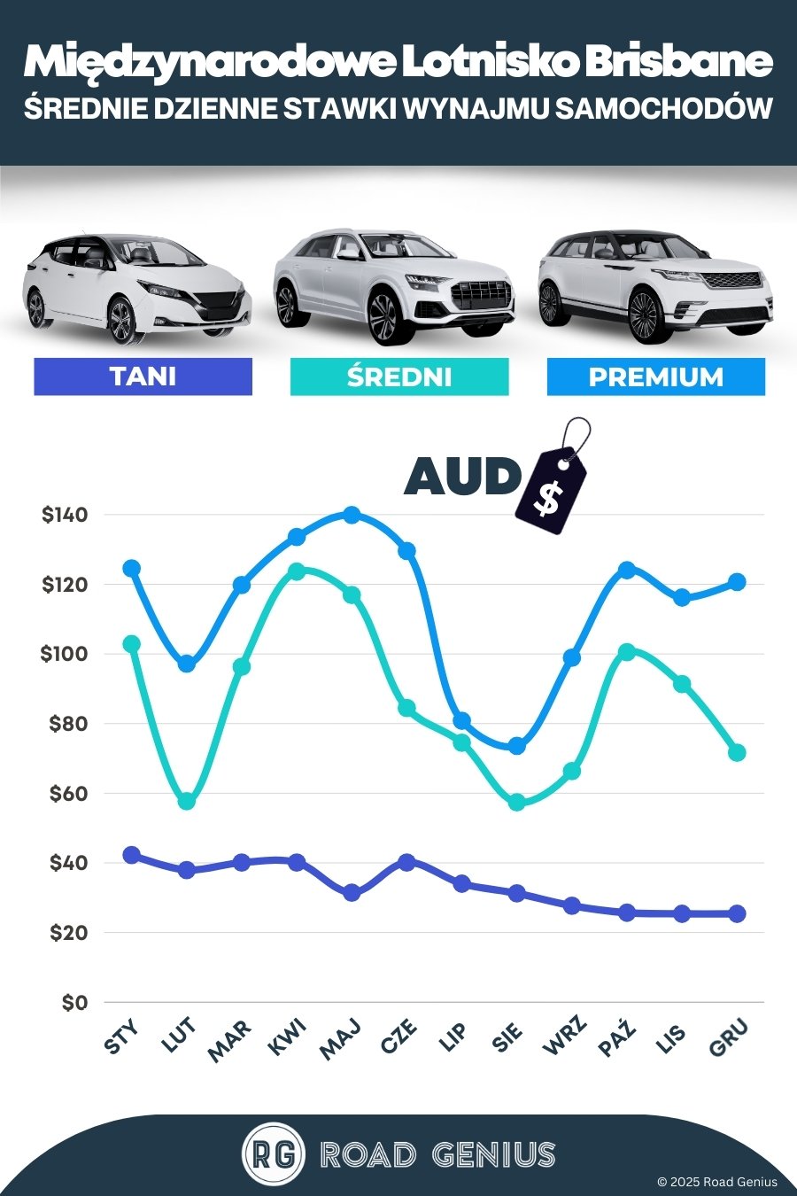 Średnio wynajem samochodu na lotnisku w Brisbane (BNE) kosztuje około 103 AUD dziennie, a najtańsze oferty zaczynają się od 25 AUD dziennie.