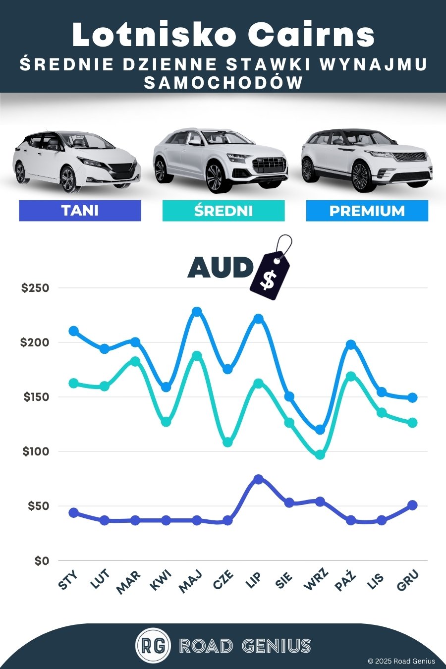 Średnio wynajem samochodu na lotnisku w Cairns (CNS) kosztuje około 159 AUD dziennie, a najtańsze oferty zaczynają się od 37 AUD dziennie.