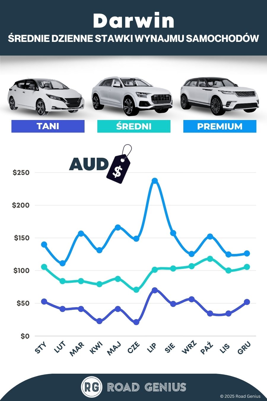 Średnio wynajem samochodu w Darwinie kosztuje około 126 AUD dziennie, a najtańsze oferty zaczynają się od 21 AUD dziennie.