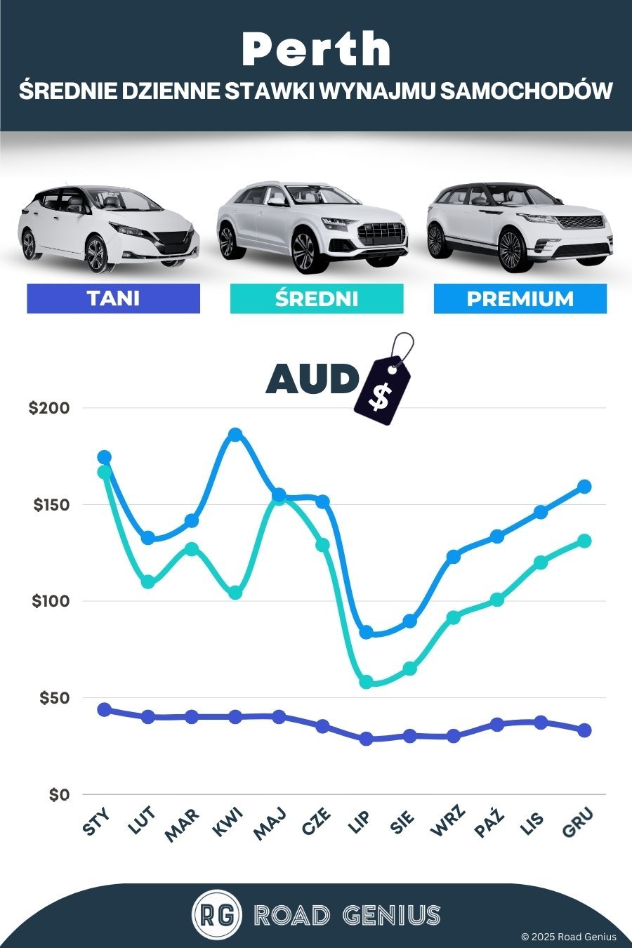 Średnio wynajem samochodu w Perth kosztuje około 122 AUD dziennie, a najtańsze oferty zaczynają się od 29 AUD dziennie.