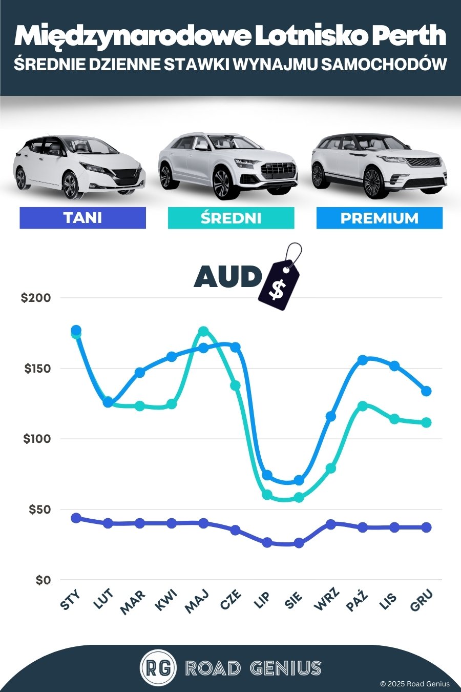 Średnio wynajem samochodu na lotnisku w Perth (PER) kosztuje około 124 AUD dziennie, a najtańsze oferty zaczynają się od 26 AUD dziennie.