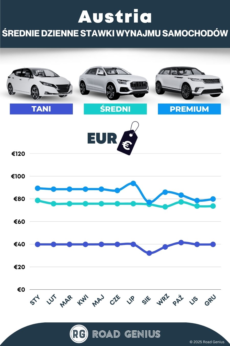 Średnio wynajem samochodu w Austrii kosztuje około €67 za dzień, przy czym najtańsze oferty zaczynają się od €32 za dzień.