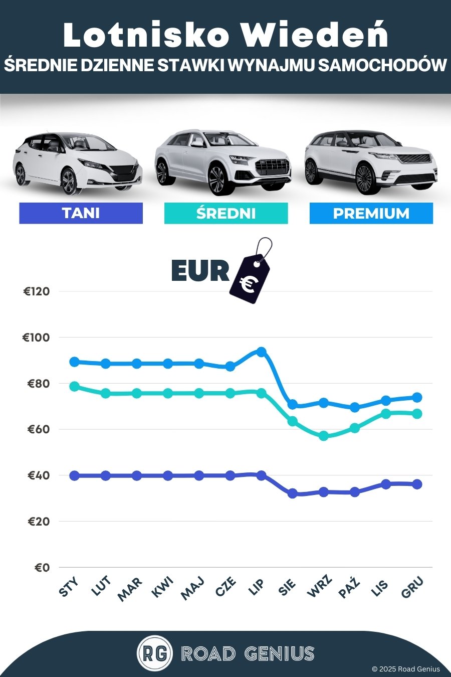Średnio wynajem samochodu na lotnisku w Wiedniu kosztuje około €63 za dzień, przy czym najtańsze oferty zaczynają się od €32 za dzień.
