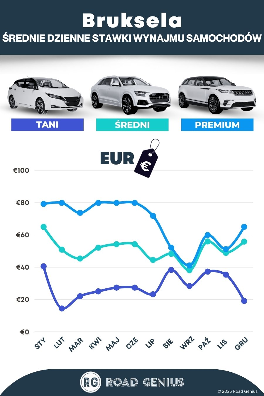 Średnio wynajem samochodu w Brukseli kosztuje około €49 za dzień, przy czym najtańsze oferty zaczynają się od €14 za dzień.
