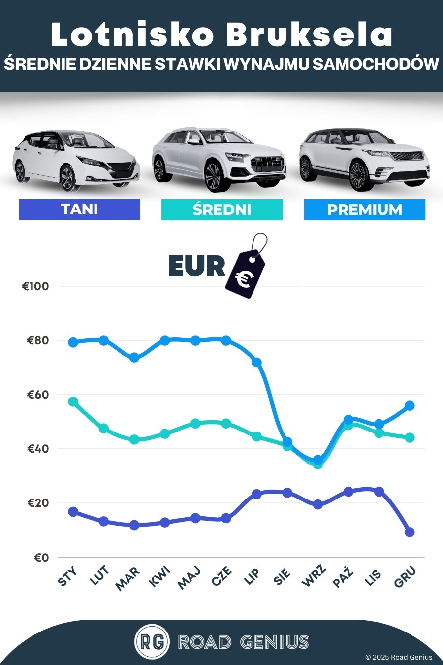 Średnio wynajem samochodu na lotnisku w Brukseli kosztuje około €43 za dzień, przy czym najtańsze oferty zaczynają się od €9 za dzień.