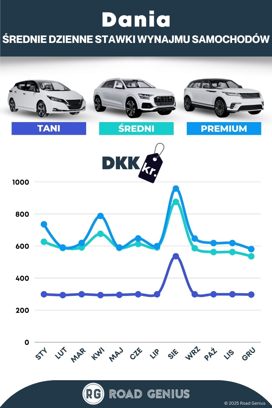 Średnio wynajem samochodu w Danii kosztuje około 533 kr za dzień, przy czym najtańsze oferty zaczynają się od 294 kr za dzień.
