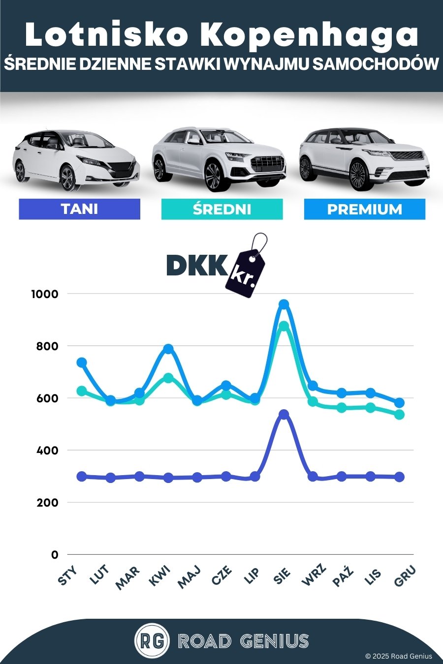 Średnio wynajem samochodu na lotnisku w Kopenhadze kosztuje około 533 kr. za dzień, przy czym najtańsze oferty zaczynają się od 294 kr. za dzień.