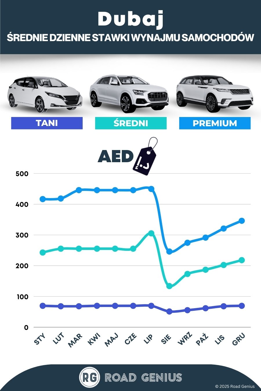 Średnio wynajem samochodu w Dubaju kosztuje około 224 AED za dzień, przy czym najtańsze oferty zaczynają się od 51 AED za dzień.
