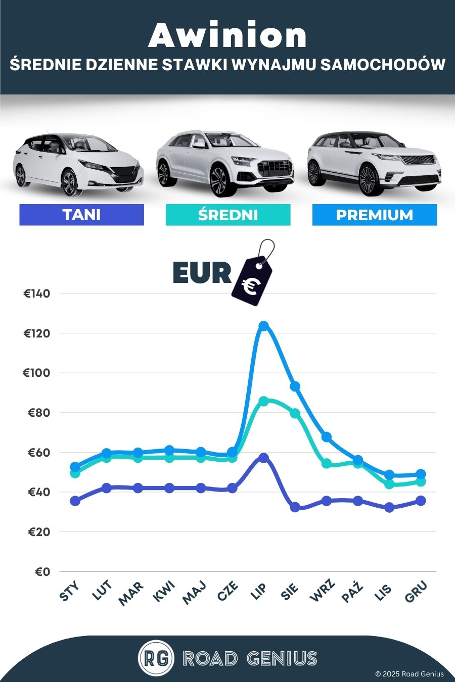 Średnio wynajem samochodu w Awinionie kosztuje około €55 za dzień, przy czym najtańsze oferty zaczynają się od €32 za dzień.