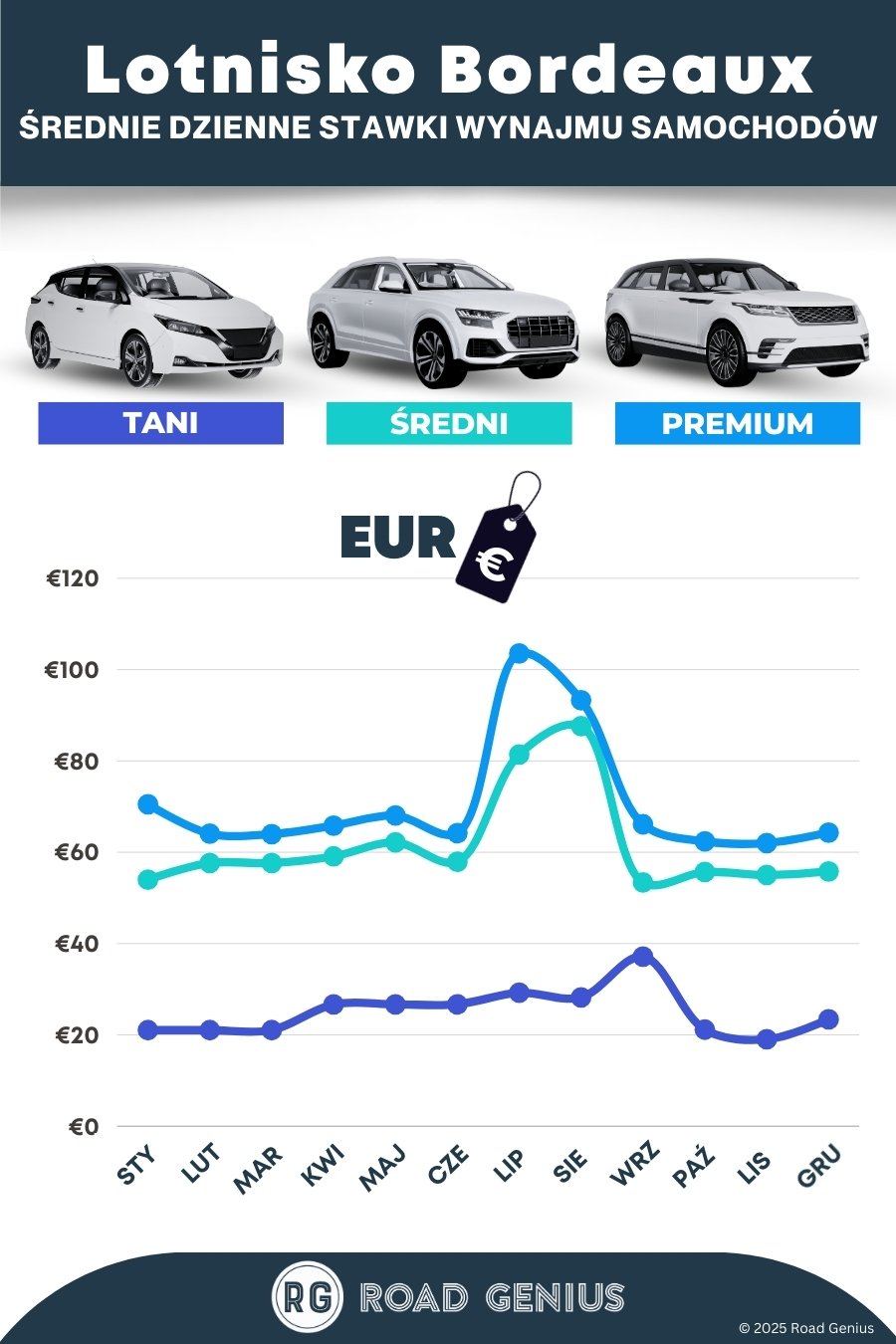 Średnio wynajem samochodu na lotnisku w Bordeaux kosztuje około €52 za dzień, przy czym najtańsze oferty zaczynają się od €19 za dzień.