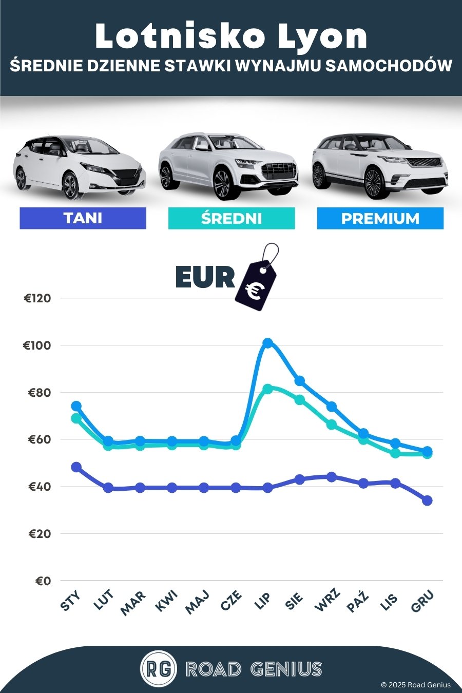 Średnio wynajem samochodu na lotnisku w Lyonie kosztuje około €57 za dzień, przy czym najtańsze oferty zaczynają się od €34 za dzień.
