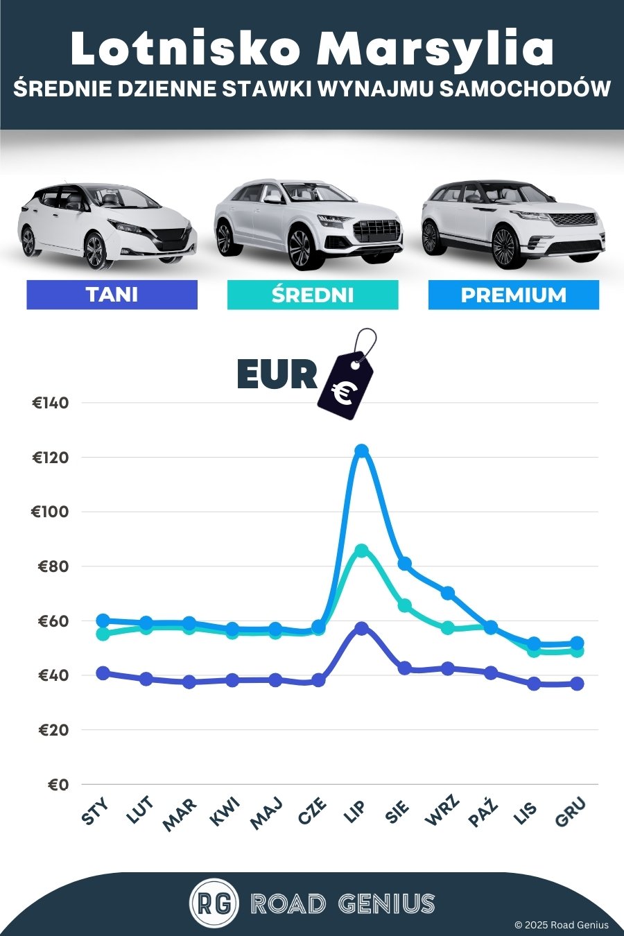 Średnio wynajem samochodu na lotnisku w Marsylii kosztuje około €55 za dzień, przy czym najtańsze oferty zaczynają się od €37 za dzień.