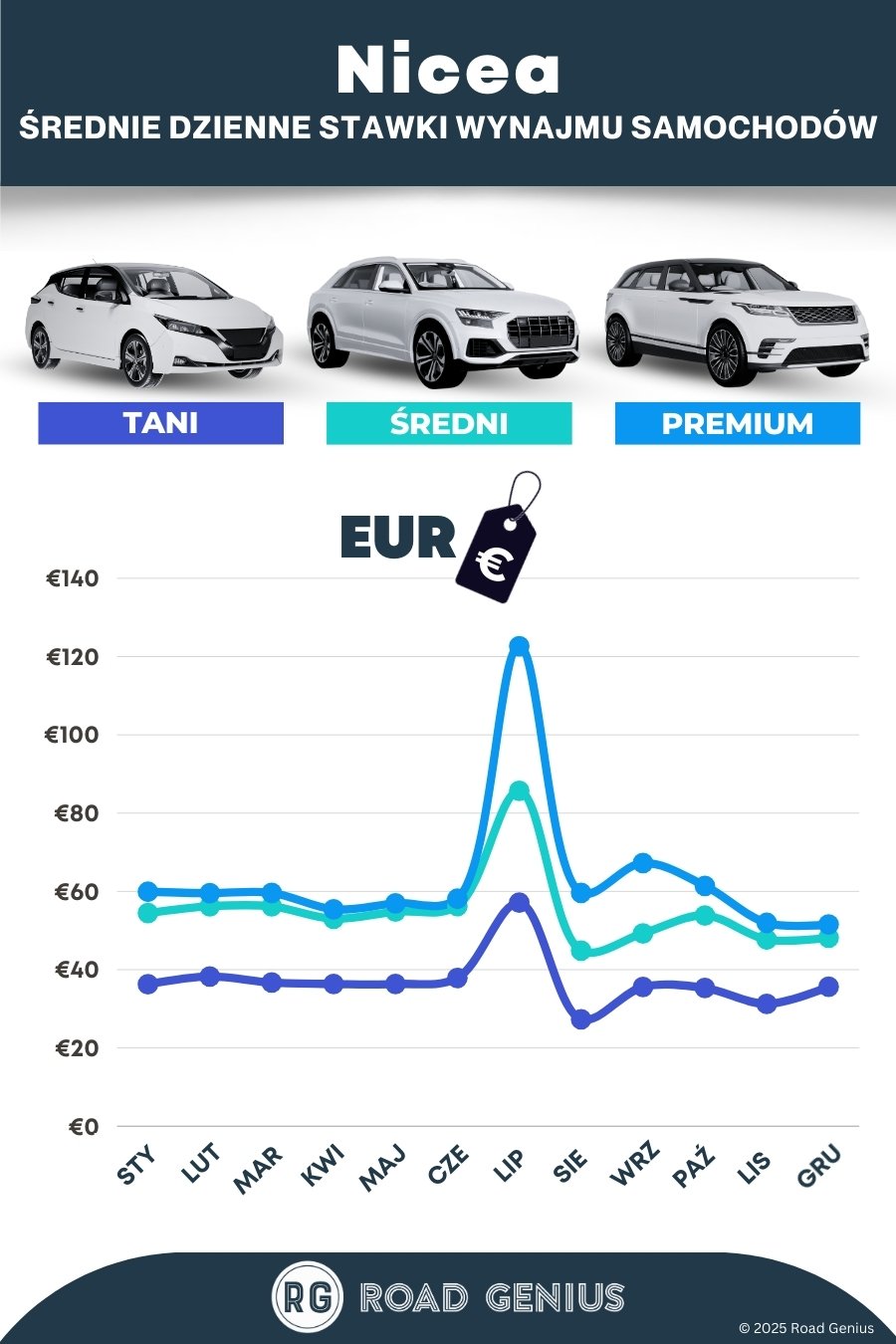 Średnio wynajem samochodu w Nicei kosztuje około €52 za dzień, przy czym najtańsze oferty zaczynają się od €27 za dzień.