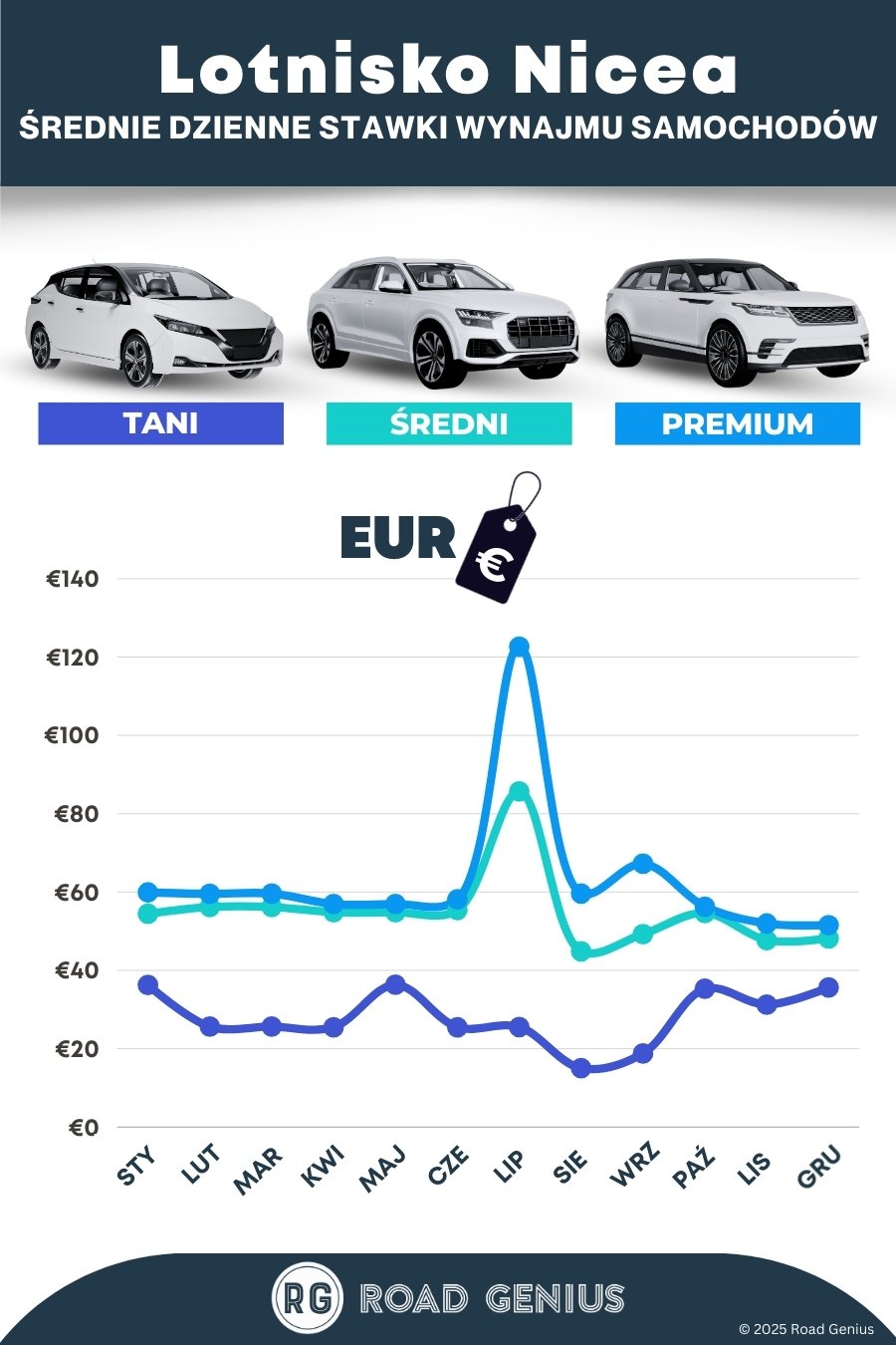 Średnio wynajem samochodu na lotnisku w Nicei kosztuje około €49 za dzień, przy czym najtańsze oferty zaczynają się od €15 za dzień.