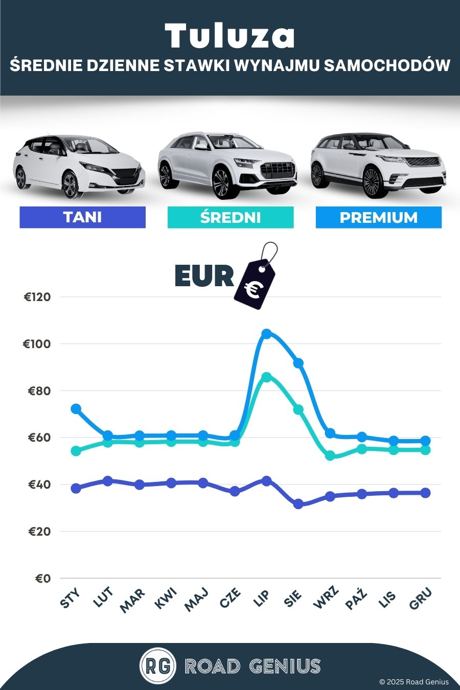 Średnio wynajem samochodu w Tuluzie kosztuje około €55 za dzień, przy czym najtańsze oferty zaczynają się od €32 za dzień.