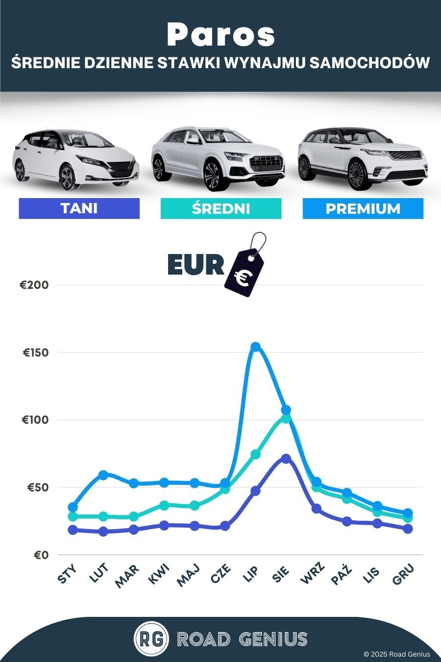 Średnio wynajem samochodu w Paros kosztuje około €45 dziennie, a najtańsze oferty zaczynają się od €17 dziennie.