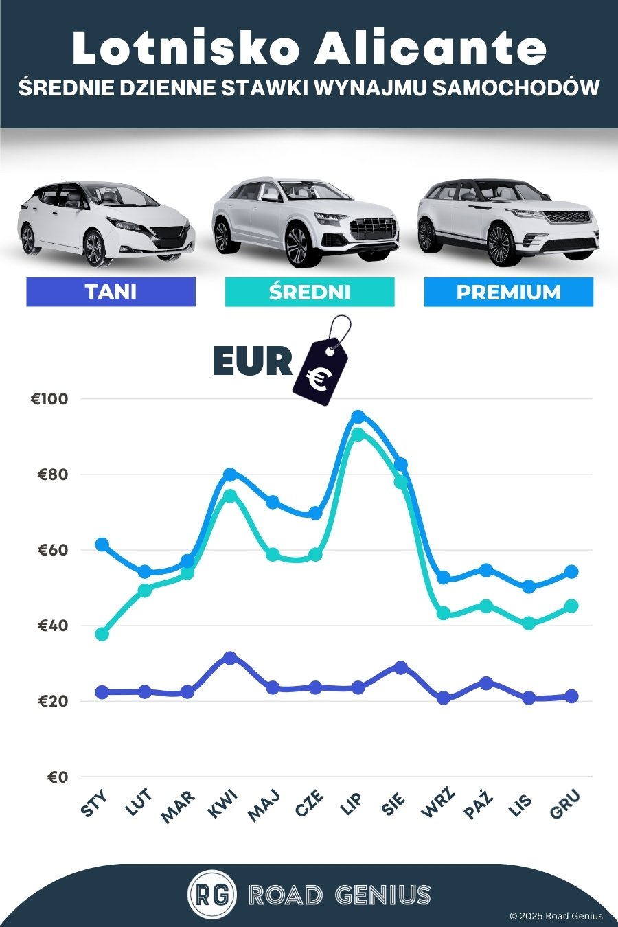 Średnio wynajem samochodu na lotnisku w Alicante kosztuje około €49 za dzień, przy czym najtańsze oferty zaczynają się od €21 za dzień.