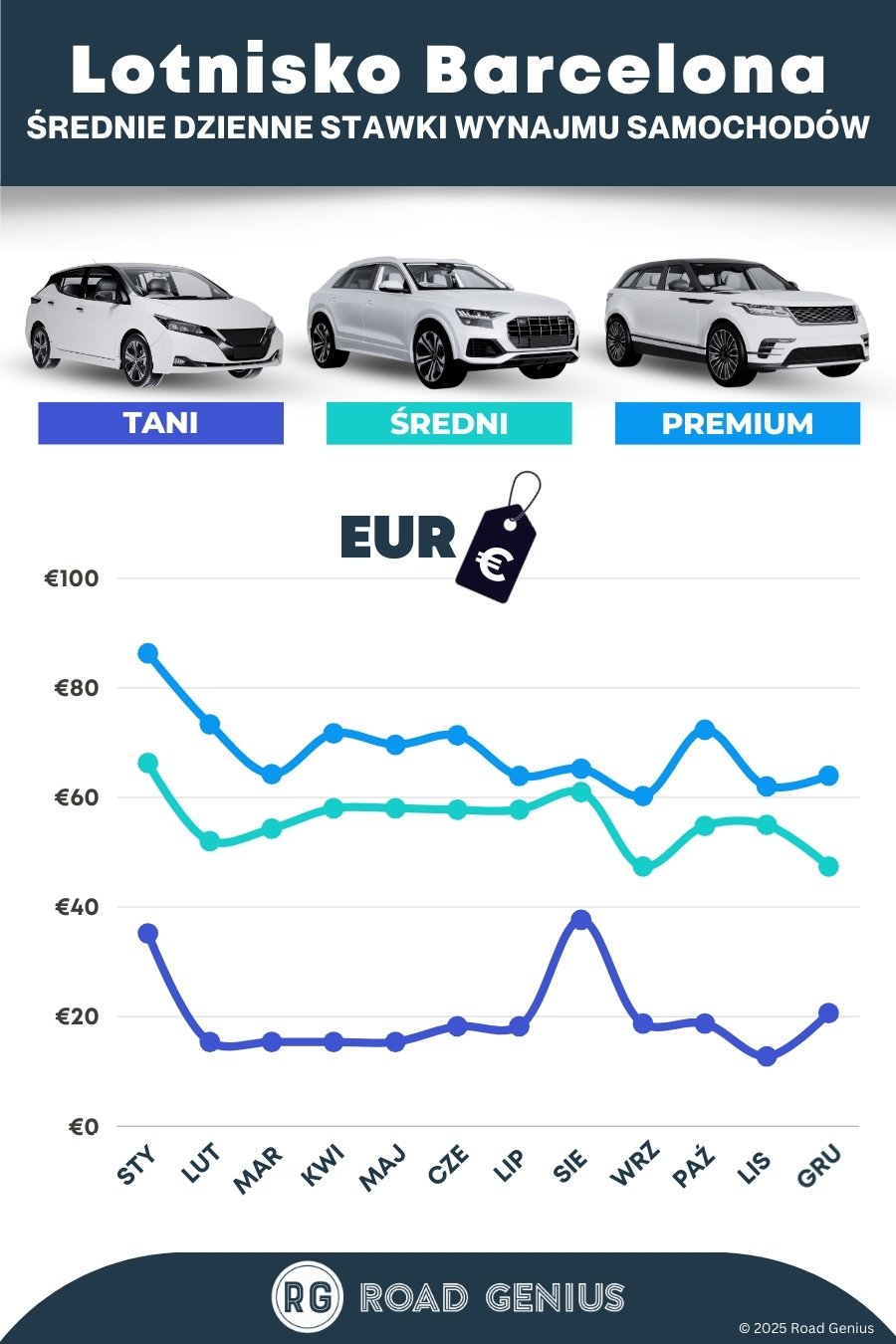 Średnio wynajem samochodu na lotnisku w Barcelonie kosztuje około €48 za dzień, przy czym najtańsze oferty zaczynają się od €13 za dzień.