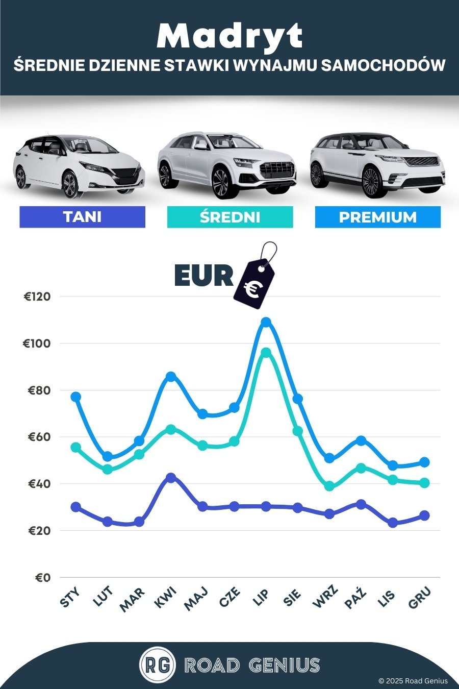 Średnio wynajem samochodu w Madrycie kosztuje około €50 za dzień, przy czym najtańsze oferty zaczynają się od €23 za dzień.