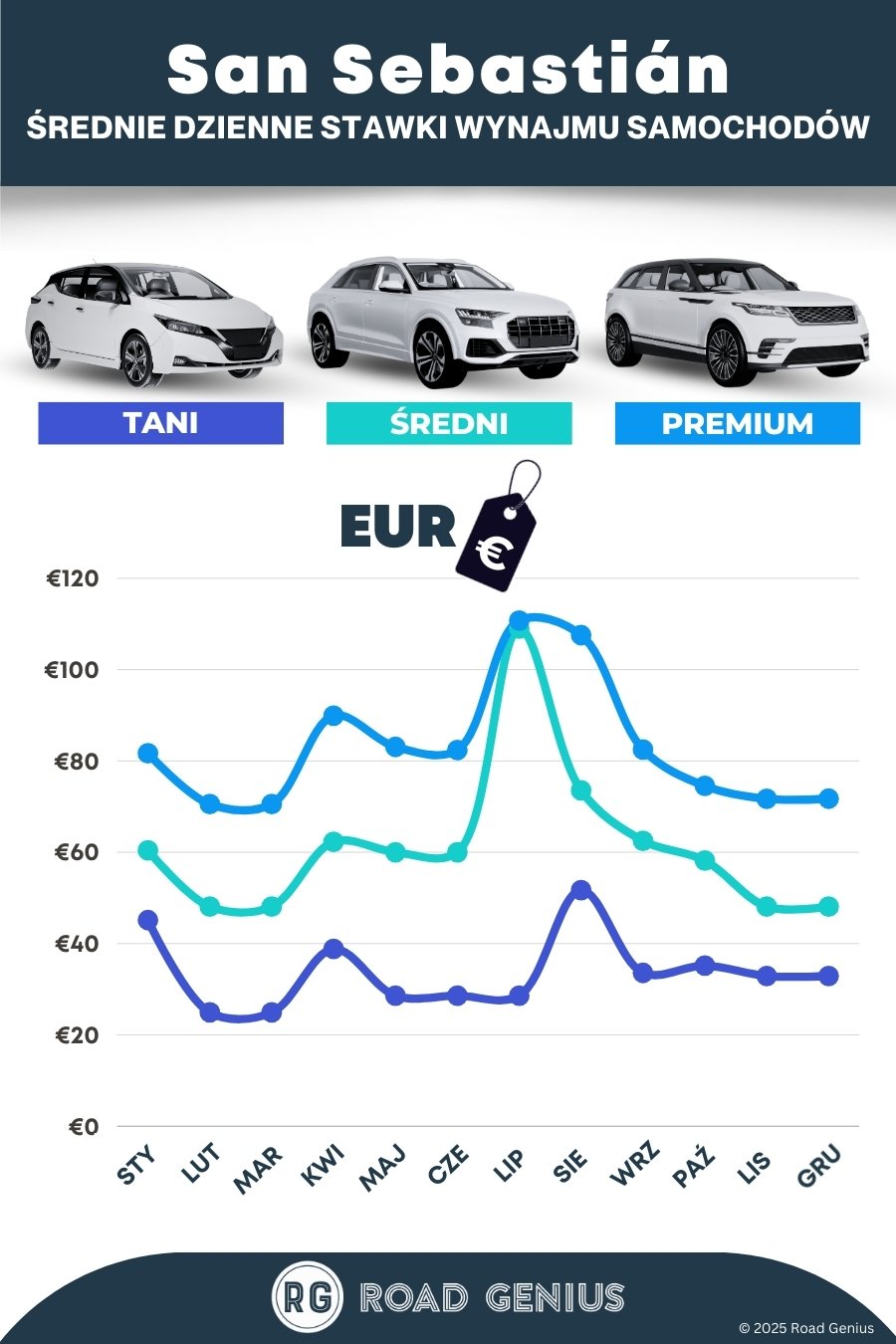 Średnio wynajem samochodu w San Sebastián kosztuje około €59 za dzień, przy czym najtańsze oferty zaczynają się od €25 za dzień.