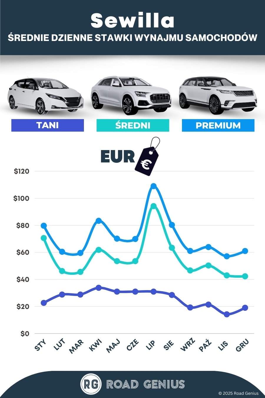 Średnio wynajem samochodu w Sewilli kosztuje około €51 za dzień, przy czym najtańsze oferty zaczynają się od €14 za dzień.