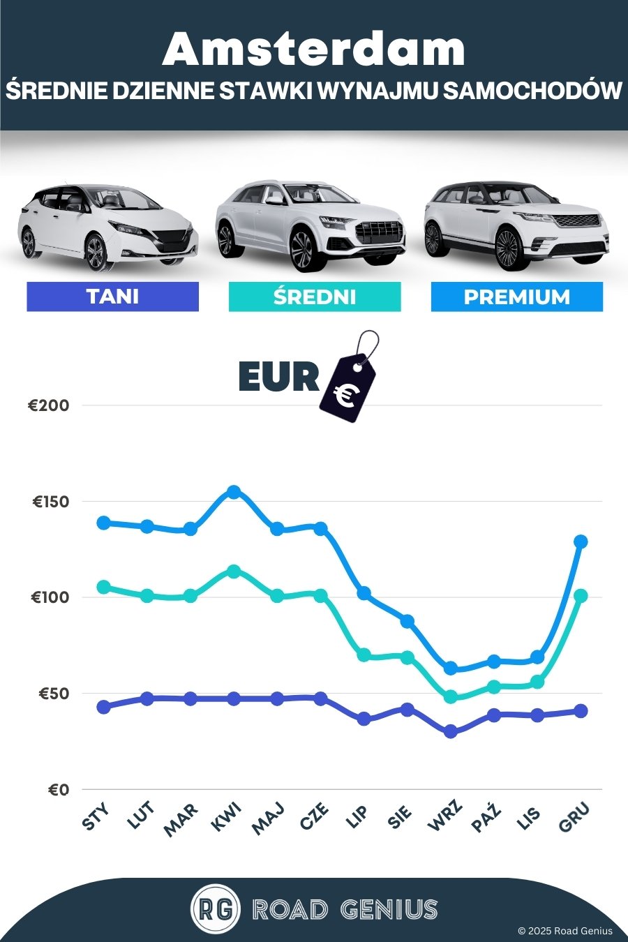 Średnio wynajem samochodu w Amsterdam kosztuje około €80 dziennie, a najtańsze oferty zaczynają się od €30 dziennie.