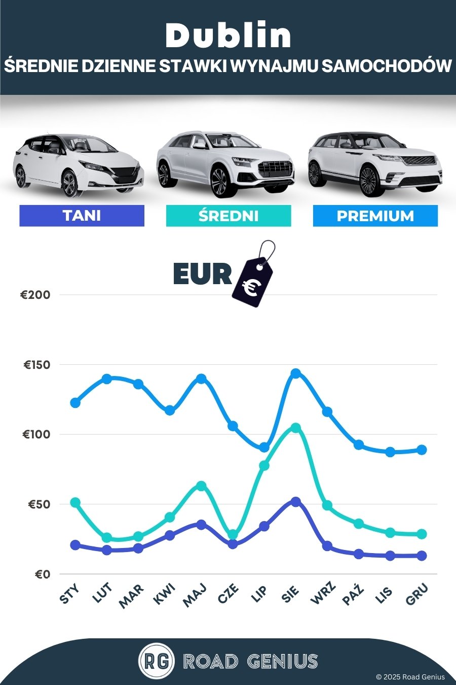 Średnio wynajem samochodu w Dublin kosztuje około €62 dziennie, a najtańsze oferty zaczynają się od €13 dziennie.