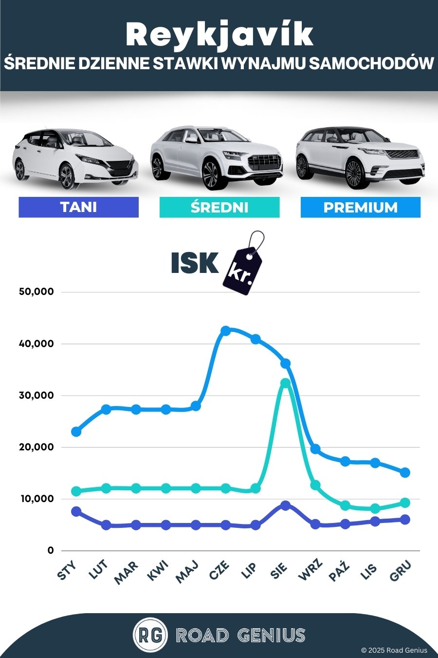 Średnio wynajem samochodu w Reykjavik kosztuje około 15,123 ISK dziennie, a najtańsze oferty zaczynają się od 4,973 ISK dziennie.