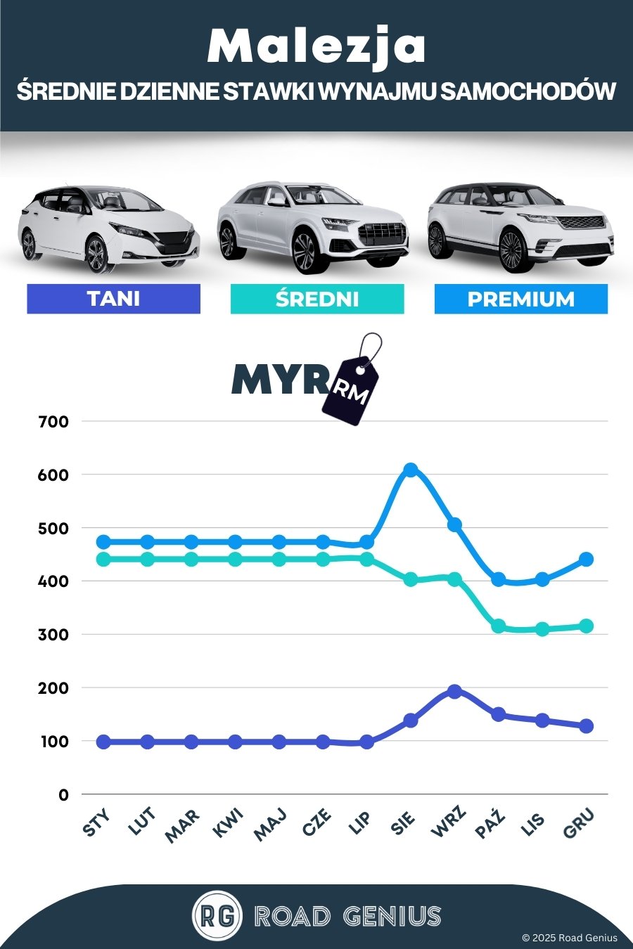 Z Road Genius łatwo znajdziesz świetne oferty wynajmu samochodów w Malezji. Porównaj ceny i zarezerwuj auto w jednym miejscu. Wyszukaj samochód do wynajęcia na lotniskach KLIA, Penang, w Johor Bahru, Kota Kinabalu i Kuching, porównując oferty międzynarodowych firm i zaufanych lokalnych wypożyczalni. Znajdziesz tu przejrzyste ceny z informacjami o ubezpieczeniu i kaucji, sprawdzisz opcje wynajmu z nielimitowanym przebiegiem lub w jedną stronę, a także poznasz wskazówki dotyczące opłat drogowych Touch 'n Go i wymogów dla kierowców w Malezji.