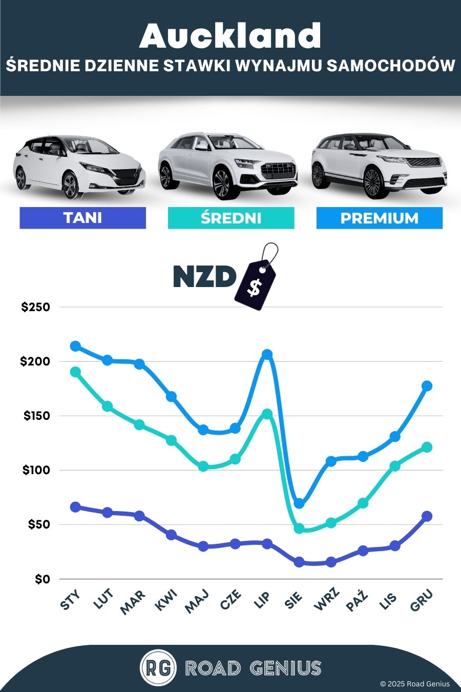 Średnio wynajem samochodu w Auckland kosztuje około 103 NZD za dzień, przy czym najtańsze oferty zaczynają się od 16 NZD za dzień.