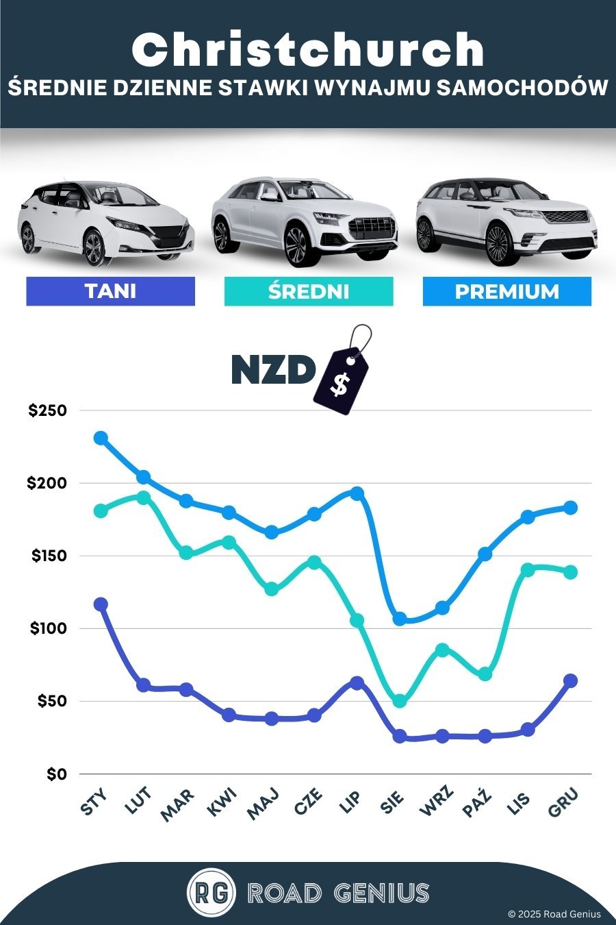 Średnio wynajem samochodu w Christchurch kosztuje około 117 NZD za dzień, przy czym najtańsze oferty zaczynają się od 26 NZD za dzień.