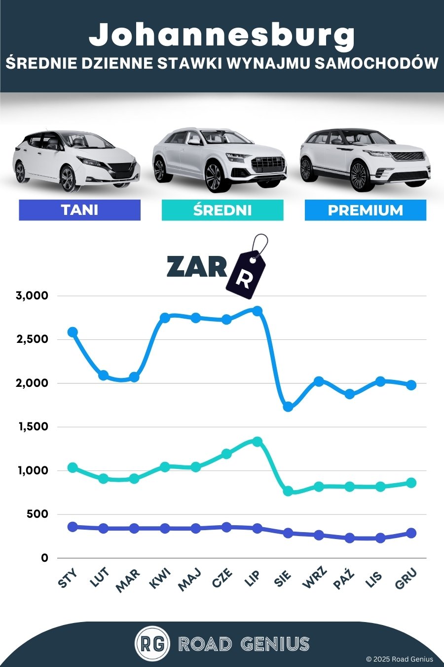 Średnio wynajem samochodu w Johannesburgu kosztuje około 1 186 ZAR za dzień, przy czym najtańsze oferty zaczynają się od 230 ZAR za dzień.