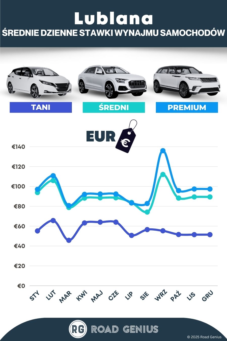 Średnio wynajem samochodu w Lublanie kosztuje około €81 za dzień, przy czym najtańsze oferty zaczynają się od €46 za dzień.
