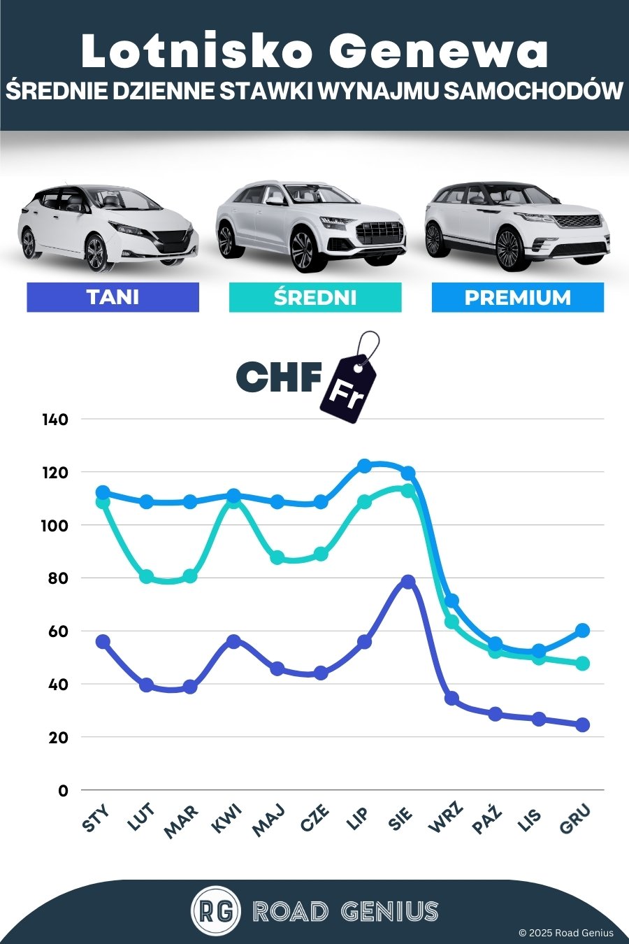 Średnio wynajem samochodu na lotnisku w Genewie kosztuje około 74 CHF za dzień, przy czym najtańsze oferty zaczynają się od 25 CHF za dzień.