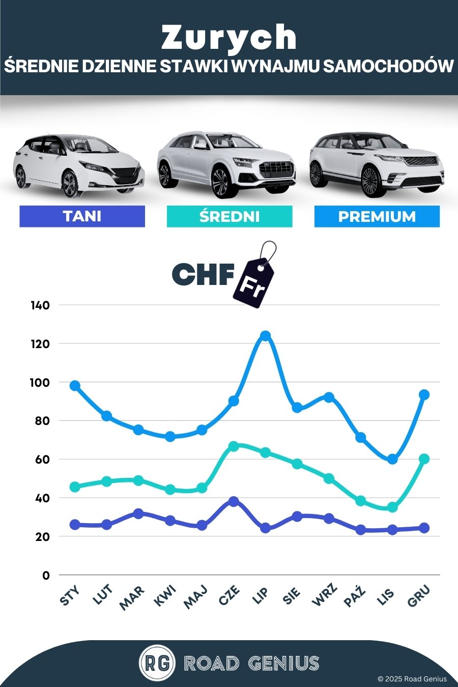 Średnio wynajem samochodu w Zurychu kosztuje około 58 CHF za dzień, przy czym najtańsze oferty zaczynają się od 23 CHF za dzień.