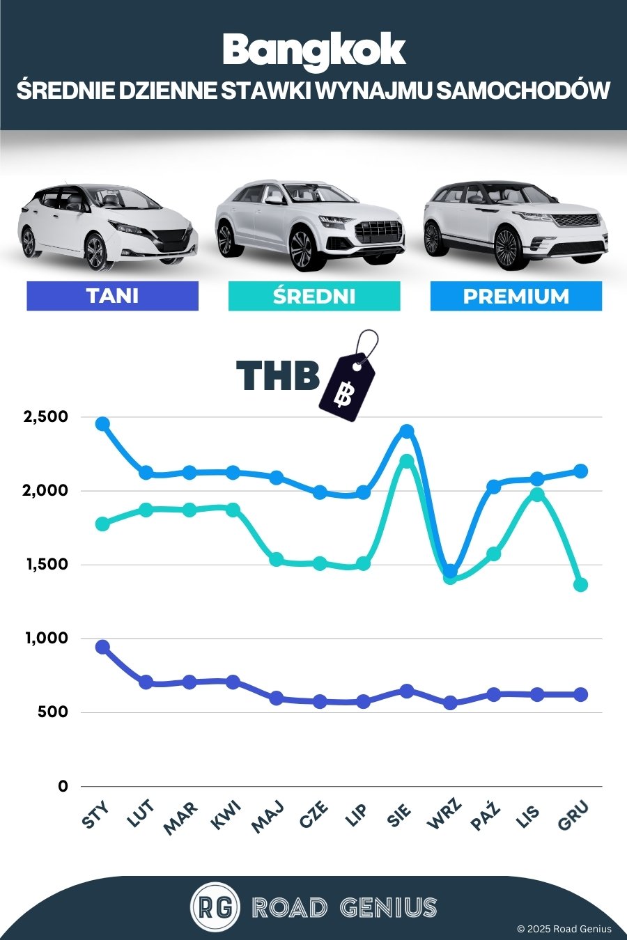 Średnio wynajem samochodu w Bangkoku kosztuje około 2 150 THB za dzień, przy czym najtańsze oferty zaczynają się od 566 THB za dzień.