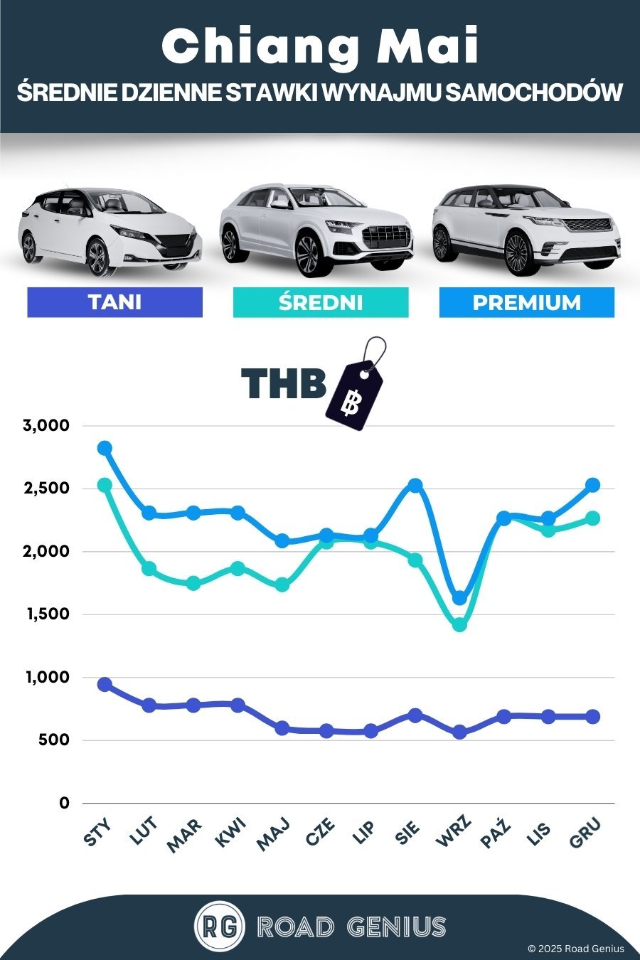 Z Road Genius łatwo znajdziesz samochody do wynajmu w Chiang Mai w konkurencyjnych cenach. Porównaj ceny SUV-ów, aut kompaktowych i minivanów, a rezerwacji dokonasz bezpłatnie. Odbierz samochód na międzynarodowym lotnisku w Chiang Mai lub w jednym z punktów w mieście – na Starym Mieście lub w dzielnicy Nimman – i ruszaj w drogę do świątyni Doi Suthep, na szczyt Doi Inthanon, do Pai lub Chiang Rai. Aby zapewnić sobie najlepszą cenę i duży wybór pojazdów, zarezerwuj auto z wyprzedzeniem, zwłaszcza jeśli planujesz podróż w szczycie sezonu (od listopada do lutego).