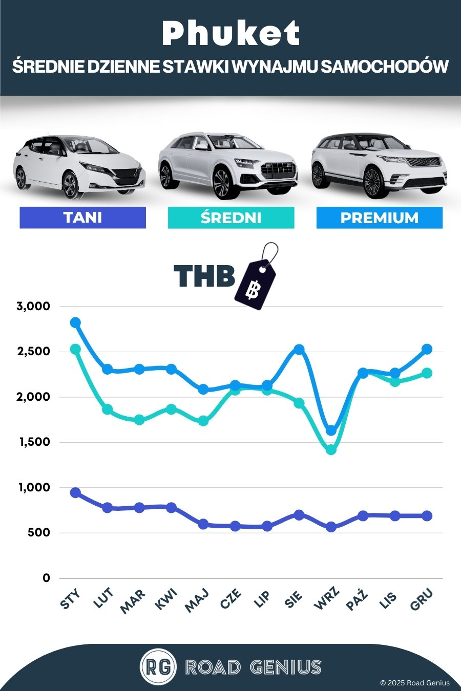 Średnio wynajem samochodu w Phuket kosztuje około 1 656 THB za dzień, przy czym najtańsze oferty zaczynają się od 566 THB za dzień.