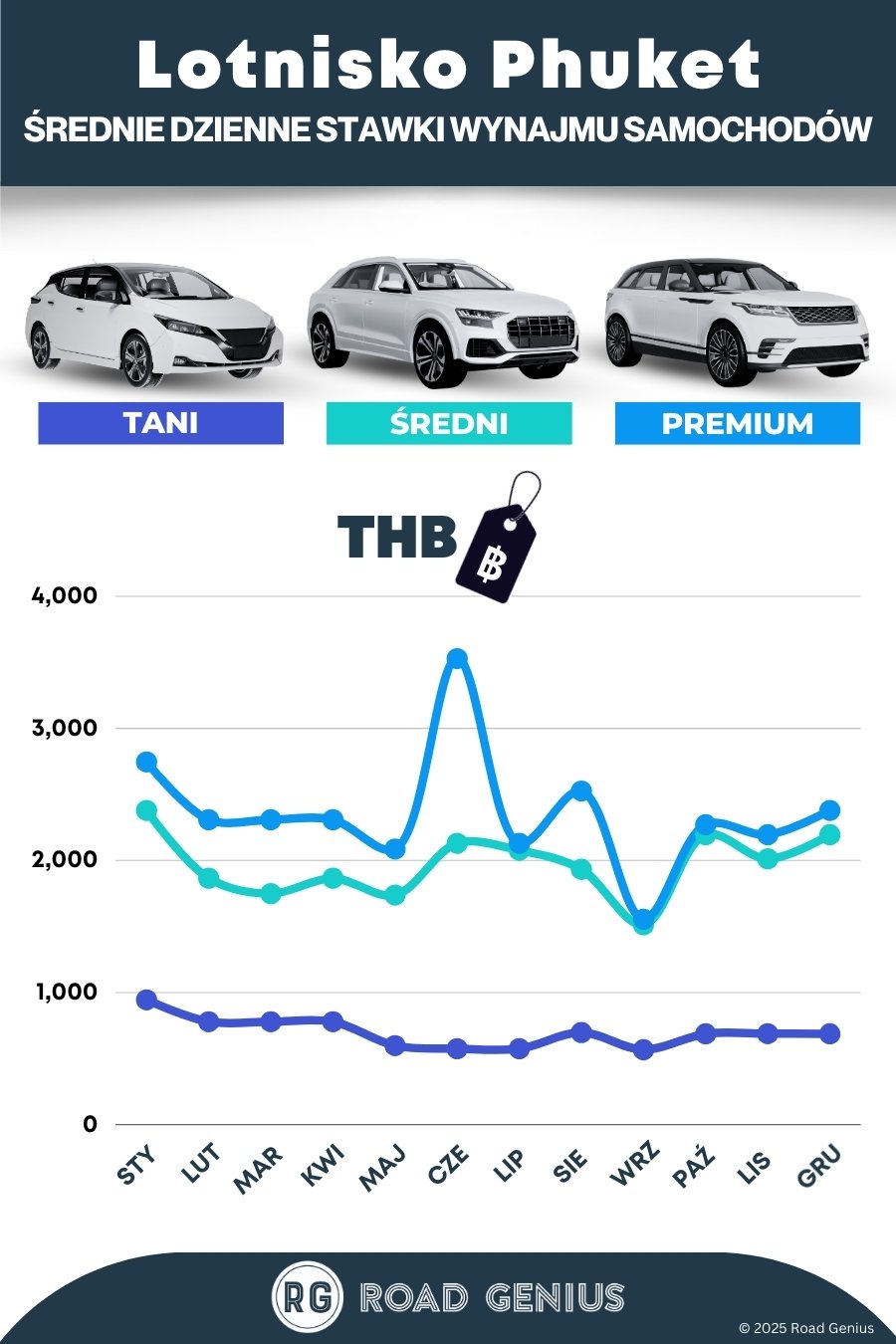 Wybierz najmniejszy samochód, który spełni twoje potrzeby: Auta klasy ekonomicznej/kompaktowej kosztują zwykle 800–1200 bahtów dziennie i są oszczędne. Przed wyborem większego modelu porównaj konkretne auta i pojemność bagażnika u różnych dostawców.