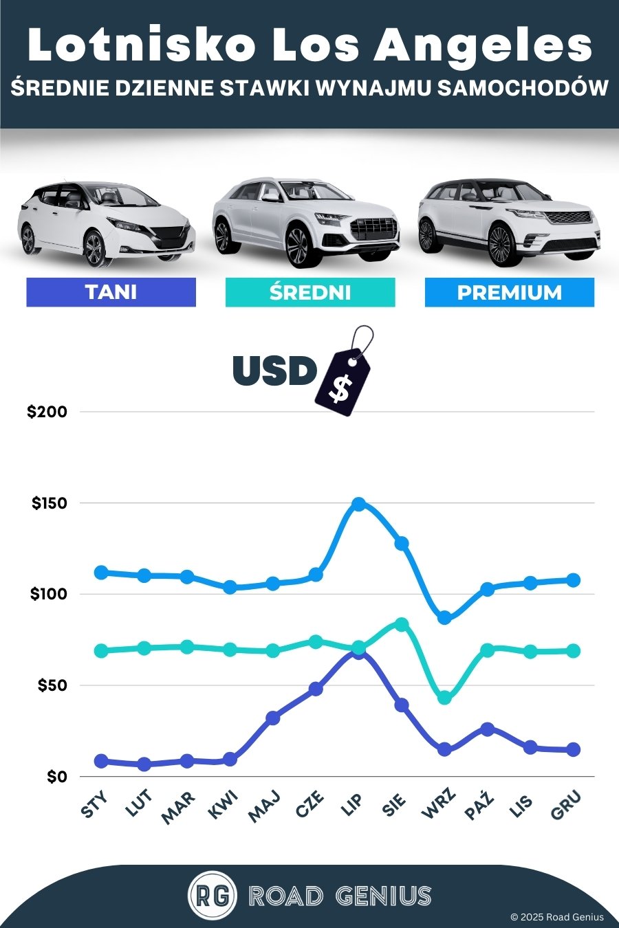 Średnio wynajem samochodu na lotnisku w Los Angeles kosztuje około 68 USD za dzień, przy czym najtańsze oferty zaczynają się od 7 USD za dzień.
