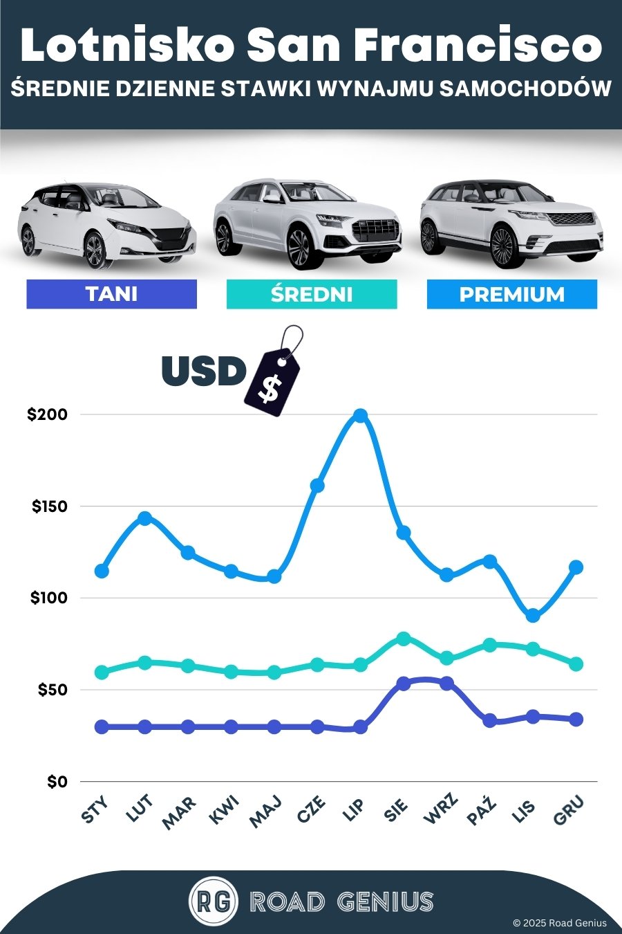 Średnio wynajem samochodu na lotnisku w San Francisco kosztuje około 76 USD za dzień, przy czym najtańsze oferty zaczynają się od 30 USD za dzień.