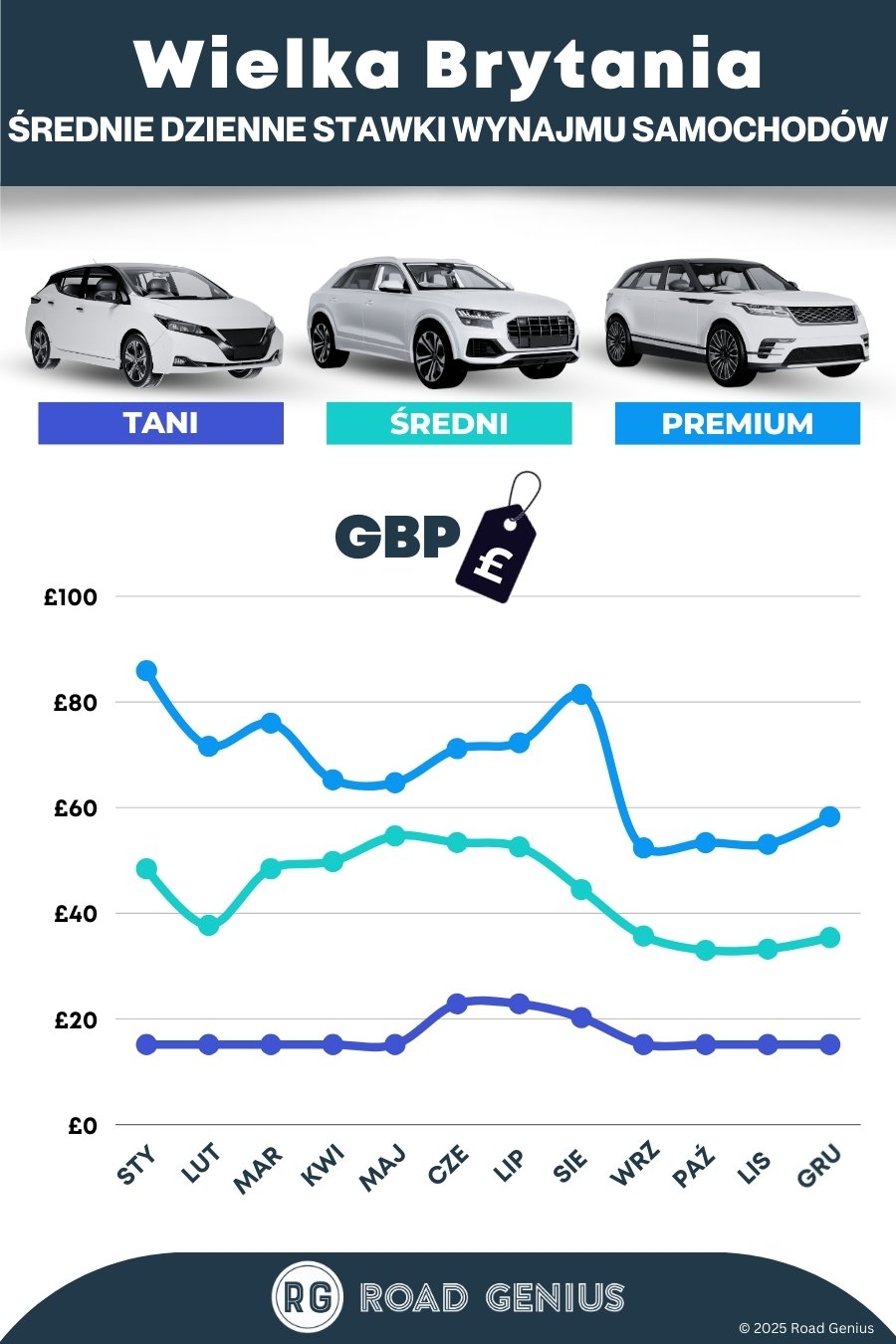 Średnio wynajem samochodu w Wielkiej Brytanii kosztuje około €43 za dzień, przy czym najtańsze oferty zaczynają się od €15 za dzień.