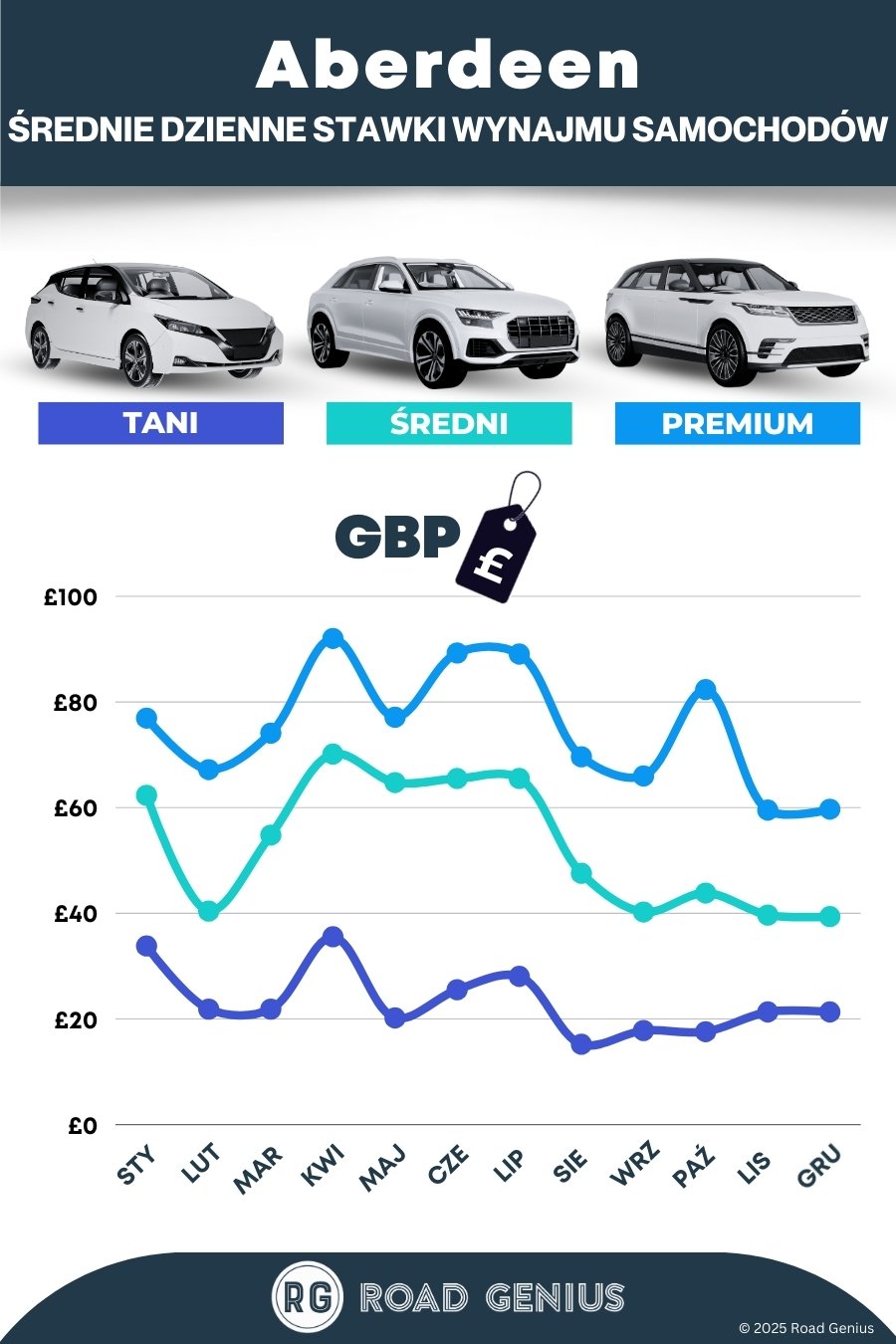Średnio wynajem samochodu w Aberdeen kosztuje około €50 za dzień, przy czym najtańsze oferty zaczynają się od €15 za dzień.