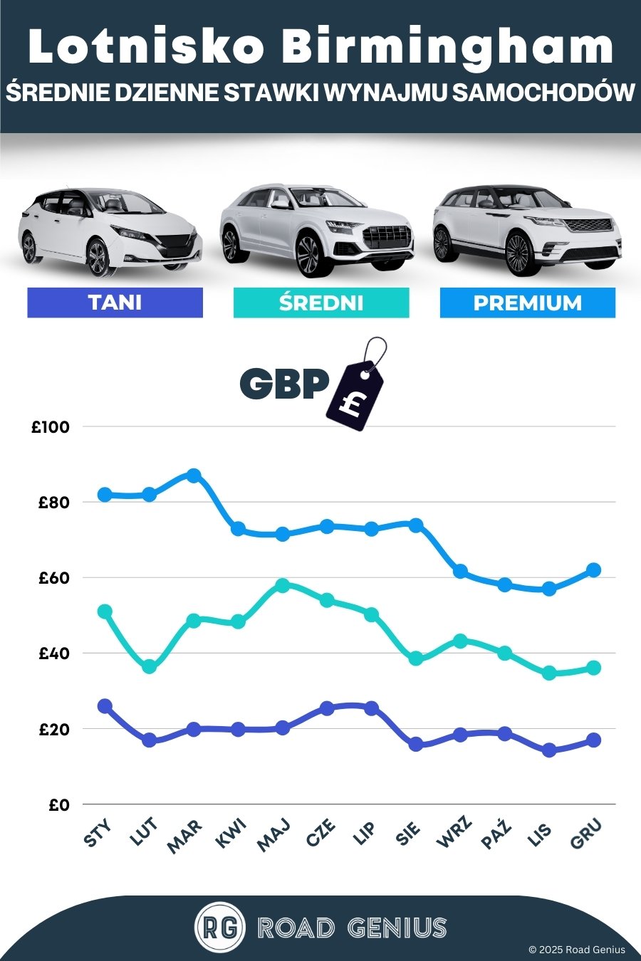 Średnio wynajem samochodu na lotnisku w Birminghamie kosztuje około €45 za dzień, przy czym najtańsze oferty zaczynają się od €14 za dzień.