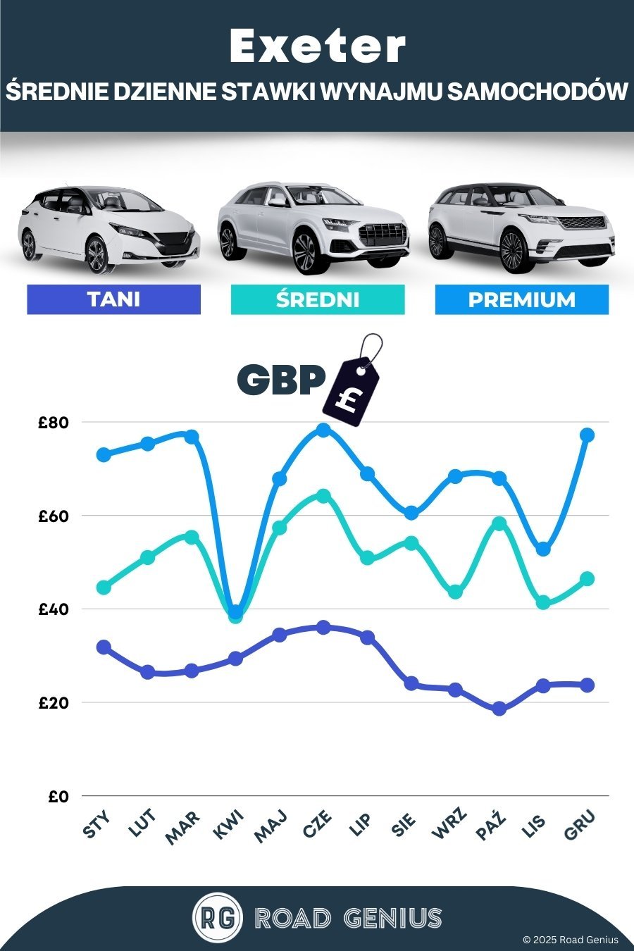 Czy są czynniki sezonowe, które należy wziąć pod uwagę przy wynajmie? Latem, zwłaszcza w wakacje szkolne, ceny są wyższe z powodu większego popytu. Trudniej też znaleźć samochód podczas uroczystości rozdania dyplomów (lipiec). Zimą w Exeter rzadko pada śnieg, ale trzeba uważać na lód i śnieg na drogach przez wrzosowiska.