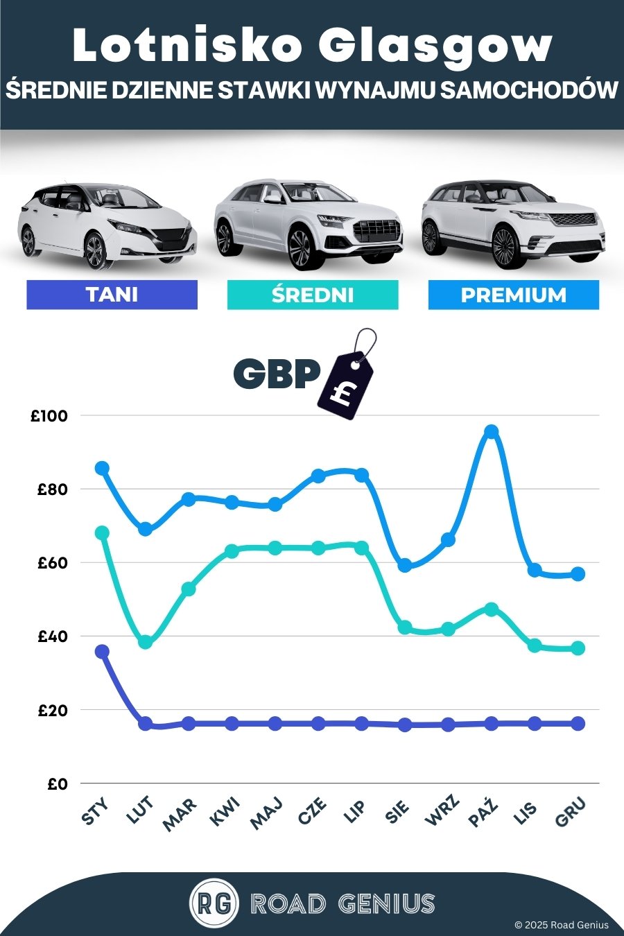 Średnio wynajem samochodu na lotnisku w Glasgow kosztuje około €48 za dzień, przy czym najtańsze oferty zaczynają się od €16 za dzień.