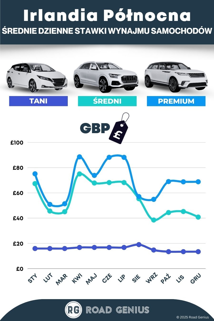 Średnio wynajem samochodu w Irlandii Północnej kosztuje około €47 za dzień, przy czym najtańsze oferty zaczynają się od €13 za dzień.