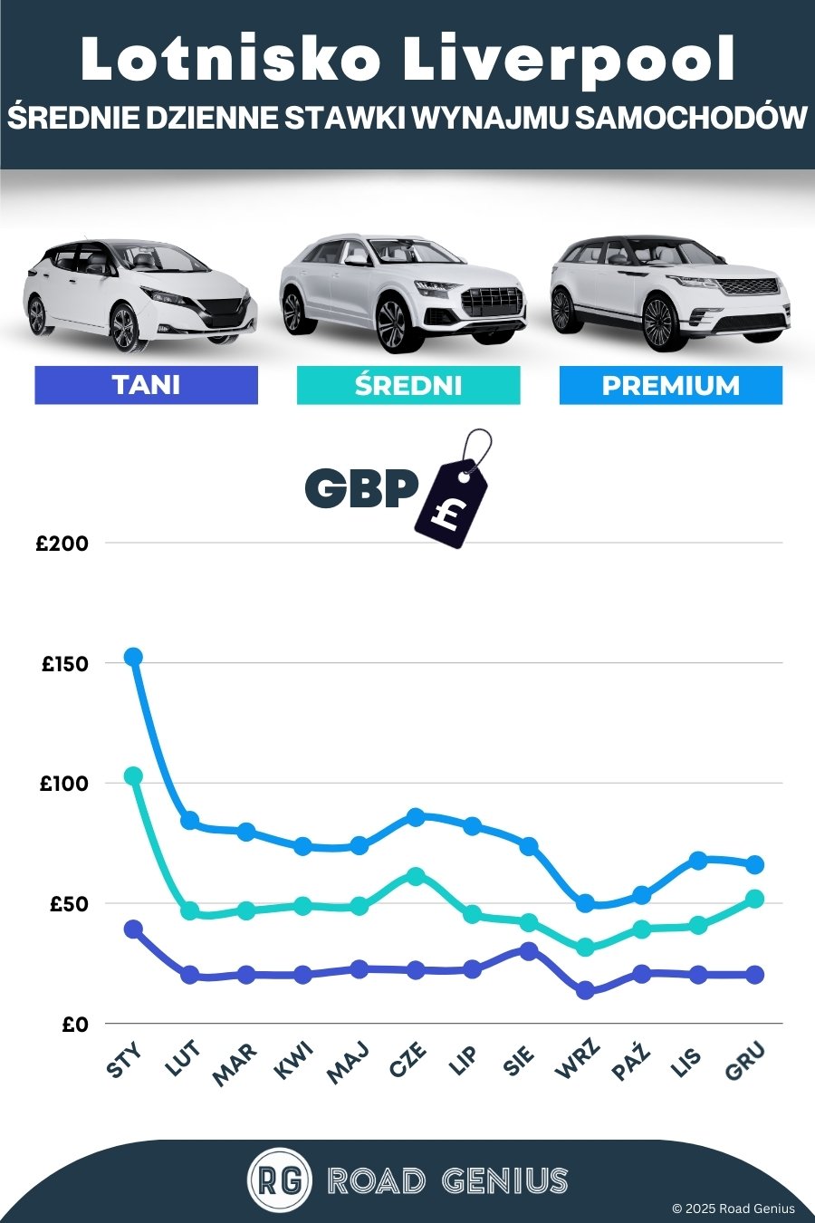 Średnio wynajem samochodu na lotnisku w Liverpoolu kosztuje około €51 za dzień, przy czym najtańsze oferty zaczynają się od €14 za dzień.